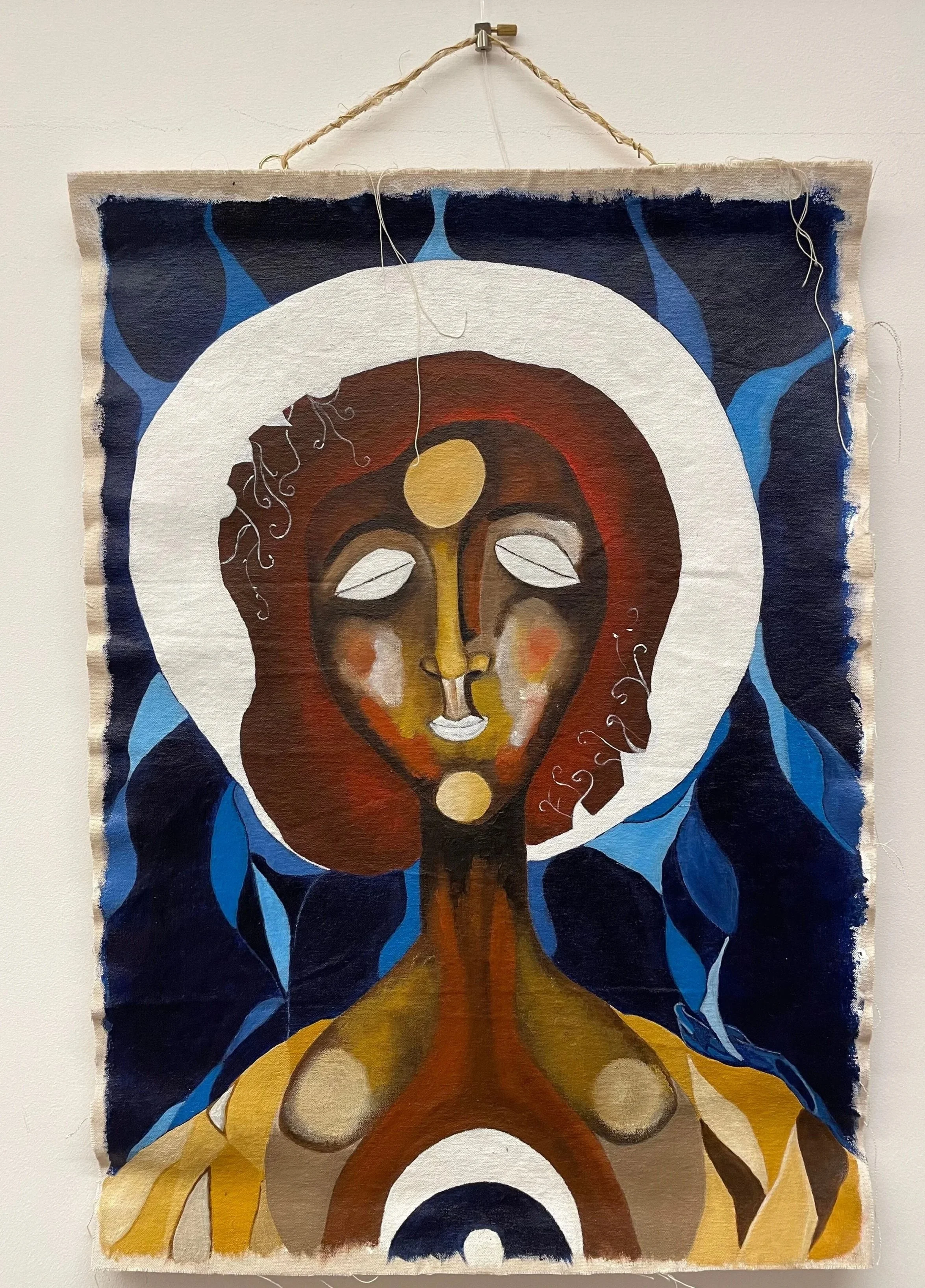 She paints on rolled canvas and prefers a rustic, more travelled look that doesn’t interfere with the deeper meaning of her works.