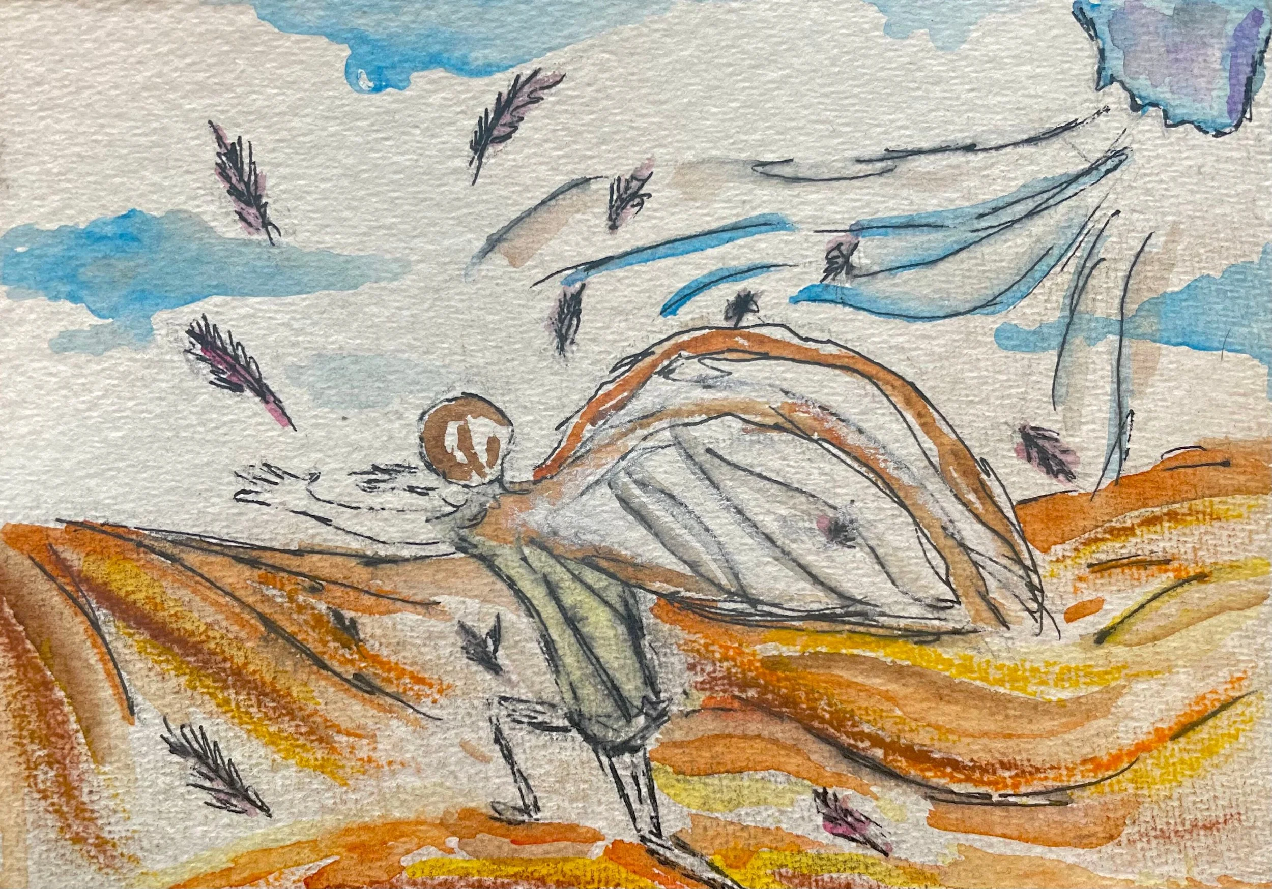 The Creator sees what is happening and decides to send down the wind of impatience. This is a storm like no other. It is so strong and whirly swirly. The baby angels run to find shelter but the wind blows away all the feathers from their wings.
